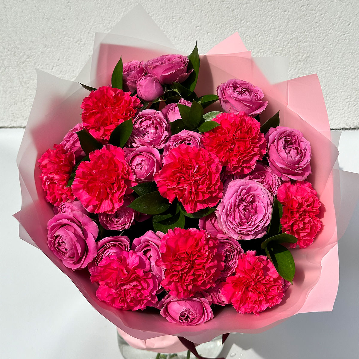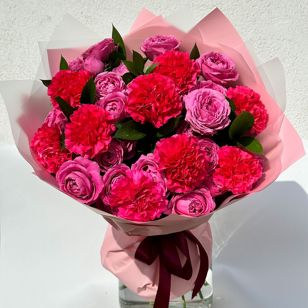 Роза одноголовая розовая, диантус бордовый. Упаковка (лента, пленка, крафт, сетка, пленка матовая)