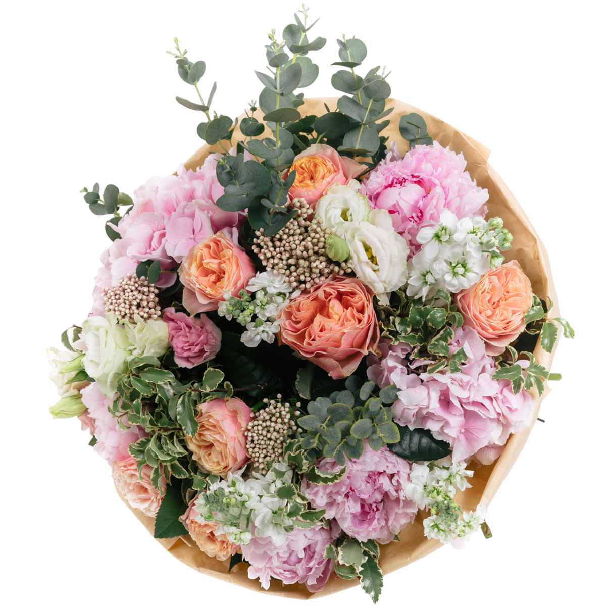 Пион розовый, роза пионовидная одноголовая персиковая, гортензия розовая, маттиола белая, эустома белая, озотамнус, эвкалипт, зелень. Упаковка (лента, пленка, крафт, сетка, пленка матовая)