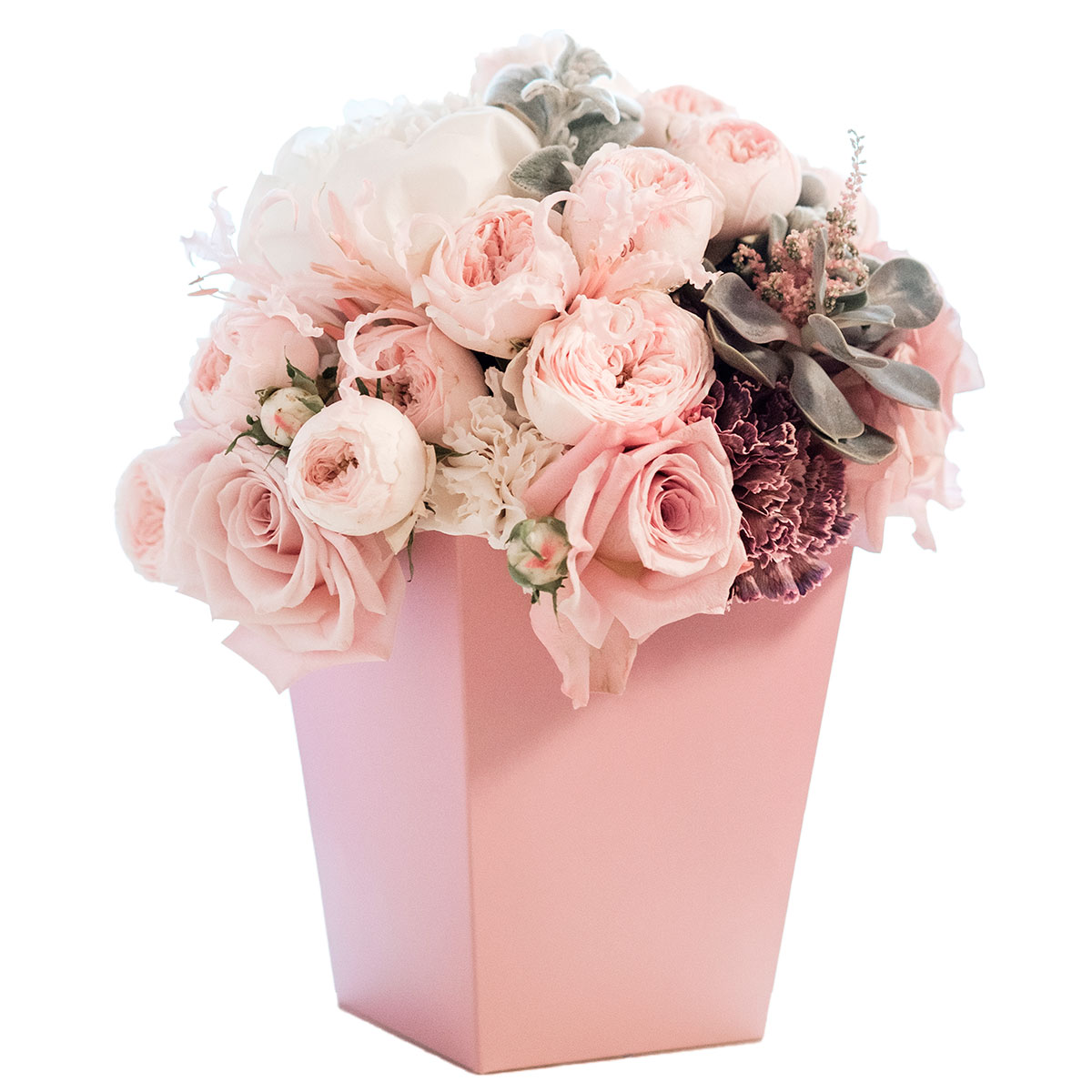 Роза пионовидная нежно розовая, роза одноголовая нежно розовая, пион белый, гвоздика бордовая, суккулент. Упаковка (шляпная коробка, квадратный бокс, коробка сердце, оазис)