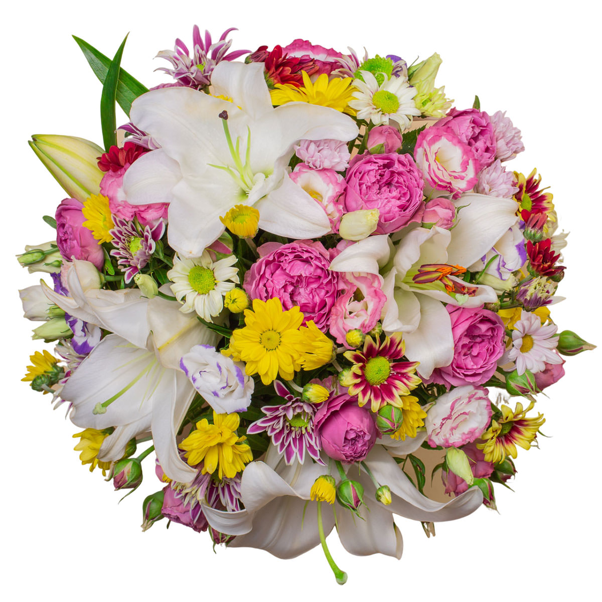 | Состав | Кустовые розы, Лилии, Пионовидные розы, Розы, Хризантемы, Эустомы |