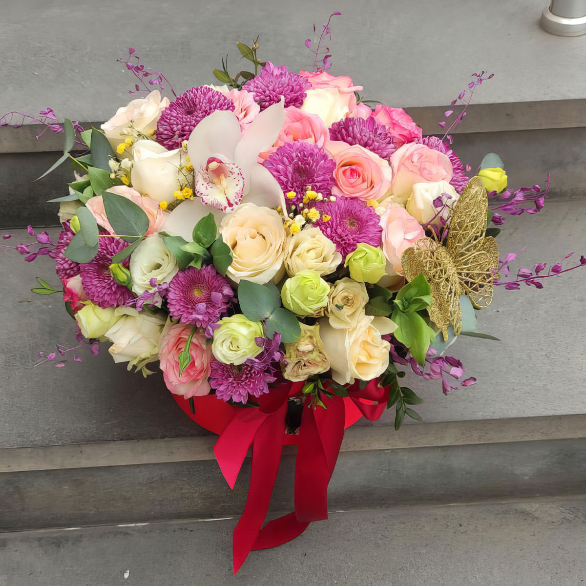 Орхидея белая, роза одноголовая кремовая, астра сиреневая, эустома бело-зеленая, гипсофила, эвкалипт, декоративная бабочка. Упаковка (шляпная коробка, квадратный бокс, коробка сердце, оазис)